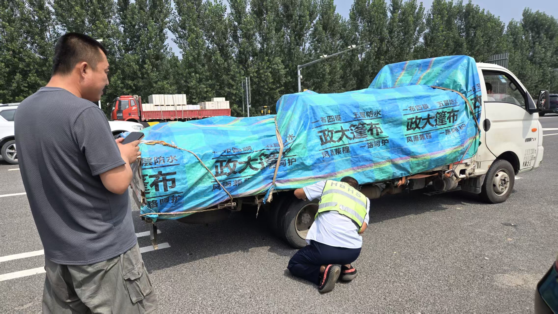 8月11日10时许,王先生驾驶货车经过香河西收费站出口时,发现车辆右后轮胎明显亏气,行驶中存在安全隐患,赶忙将车辆停靠在收费广场路边。正当他焦急万分,不知如何是好时,正在疏导车流的班长发现了这一情况,立即上前询问。