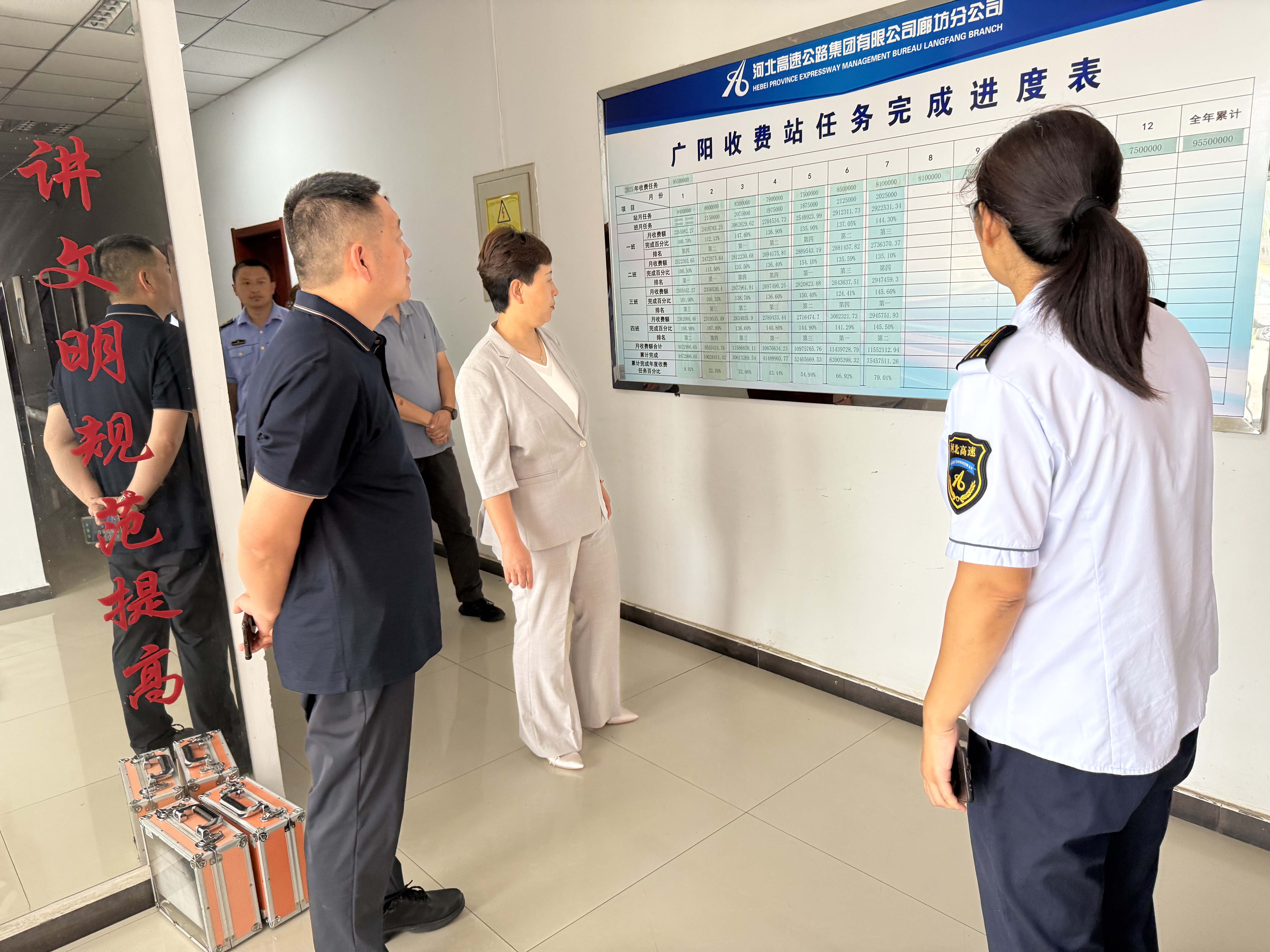8月13日下午,廊坊分公司总经理杨亮、副总经理弓春燕到广阳收费站调研指导工作,运营管理部经理陪同。