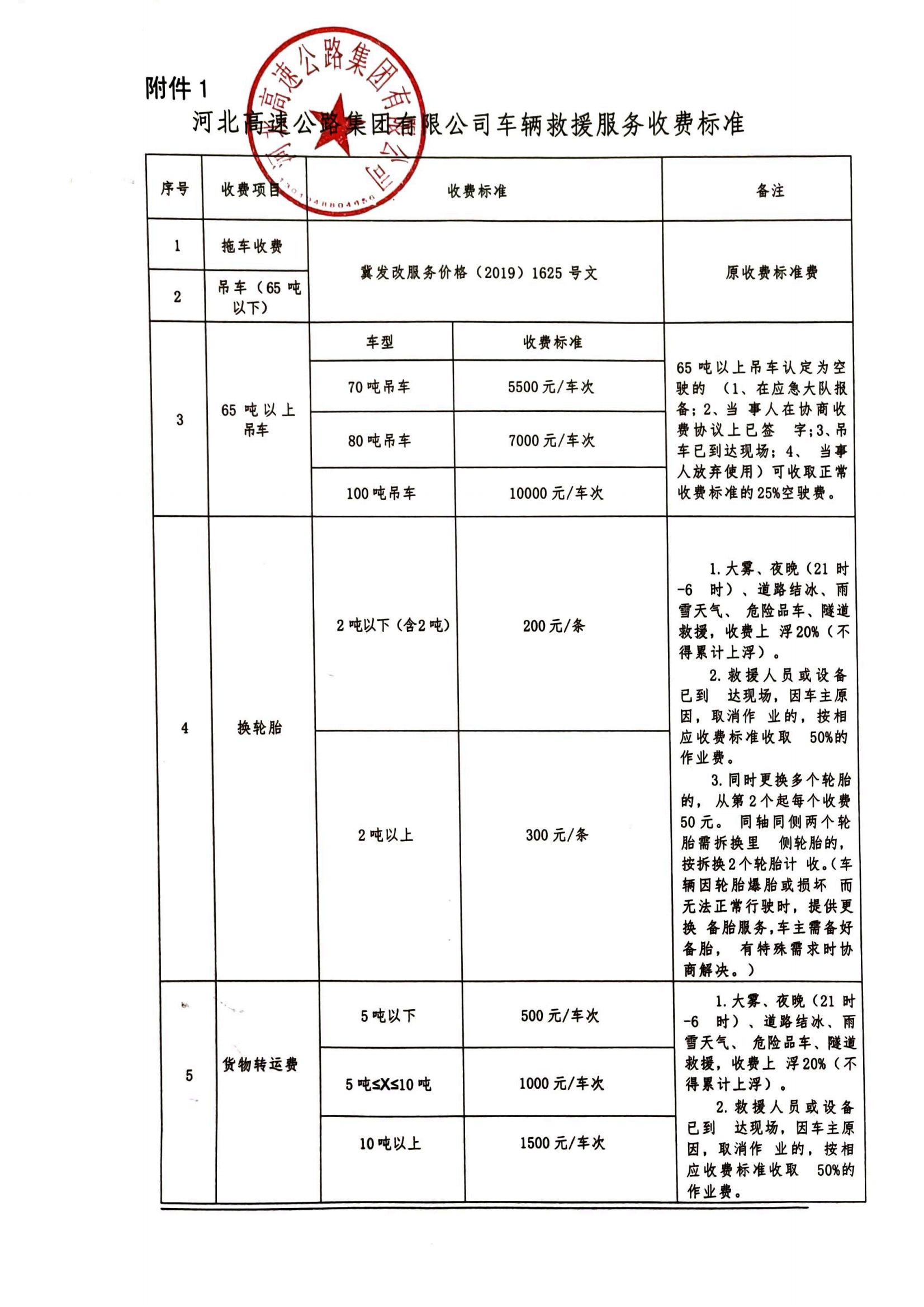 河北高速公路集团有限公司车辆救援服务收费标准