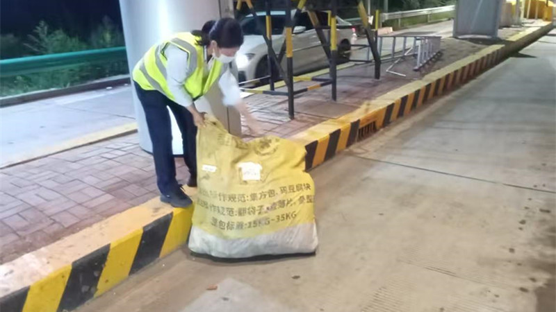 8月25日20时许,夜色中的香河收费站车流渐缓,一辆韵达快递货车完成缴费通行后,收费员突然发现车道内多了一袋鼓胀的货物——显然是车辆行驶中不慎掉落。