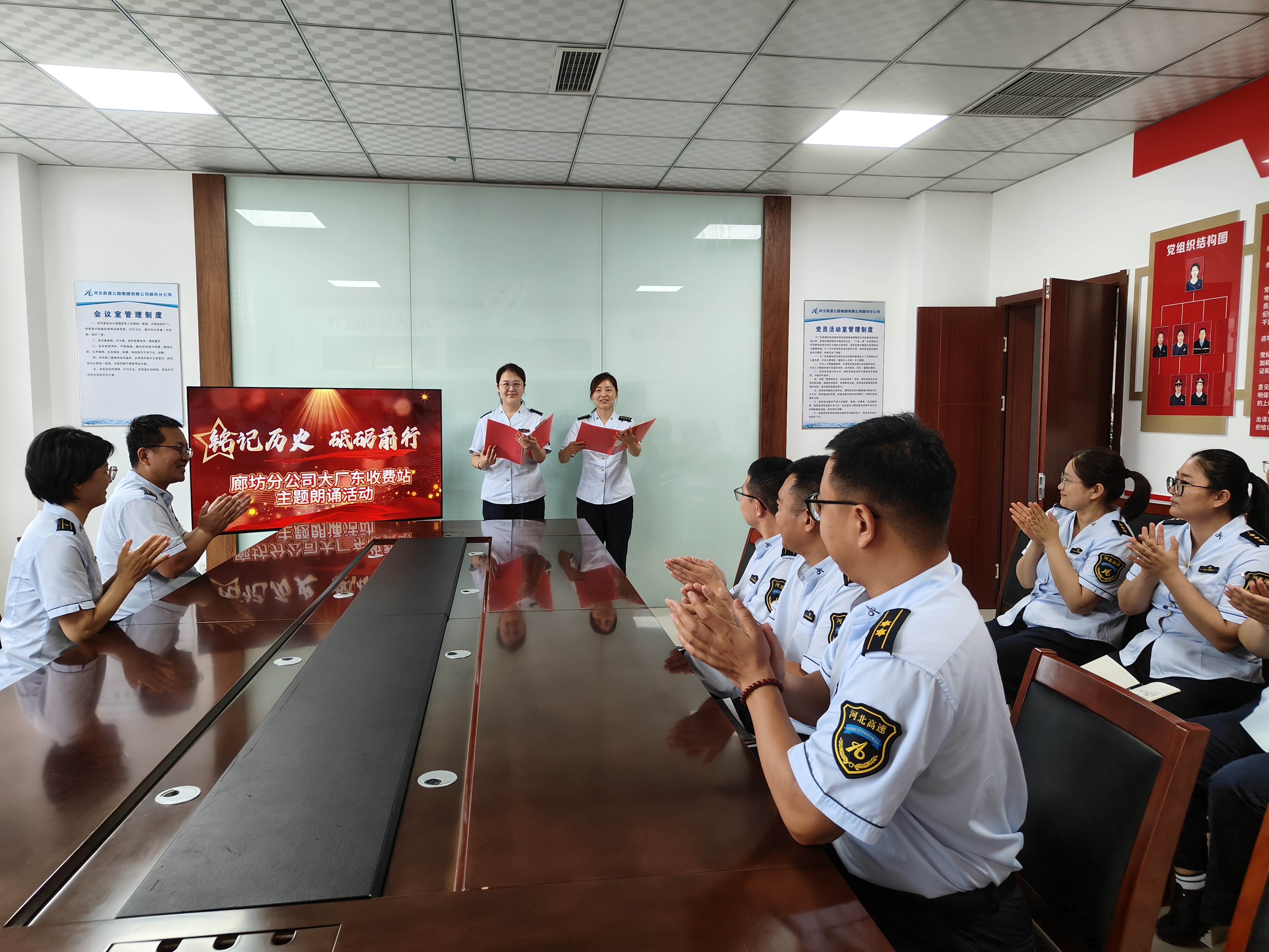 近日,大厂东收费站组织全体职工开展了以“铭记历史 砥砺前行”为主题的朗诵活动,传承红色基因,弘扬爱国主义精神,激发全体职工的爱国热情。