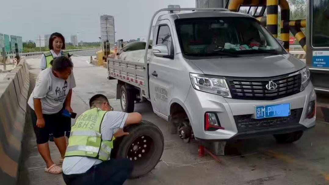 9月1日15时许,一辆银灰色小货车驶离三河南收费车道时,右前轮突然发出“砰”的异响,轮胎瞬间瘪陷,车身向右侧明显倾斜,最终停在车道中央。司机下车查看后,面对突发故障手足无措,面露急色。