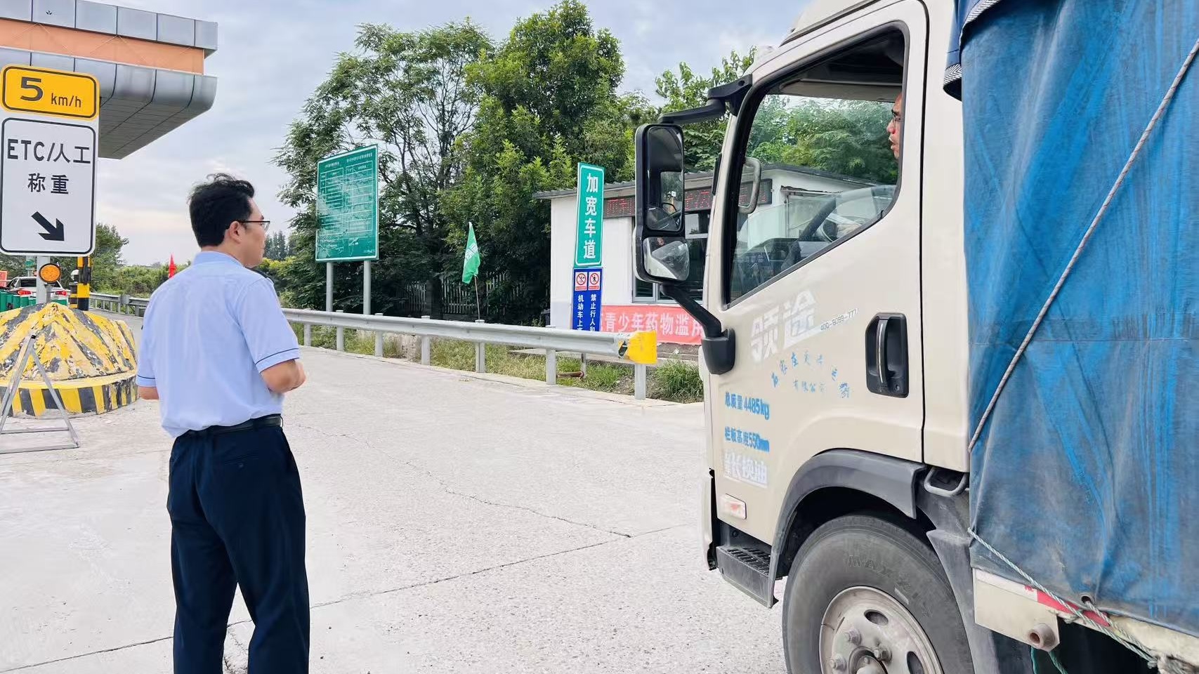9月23日,东湾收费站入口广场上一片繁忙,车辆正有序进入高速。突然,一辆货车停在了广场中央,后方车辆不得不紧急避让。工作人员第一时间上前查看,发现司机正焦急地询问:“涿州方向怎么封闭了?我们送货紧急,耽误不得!”