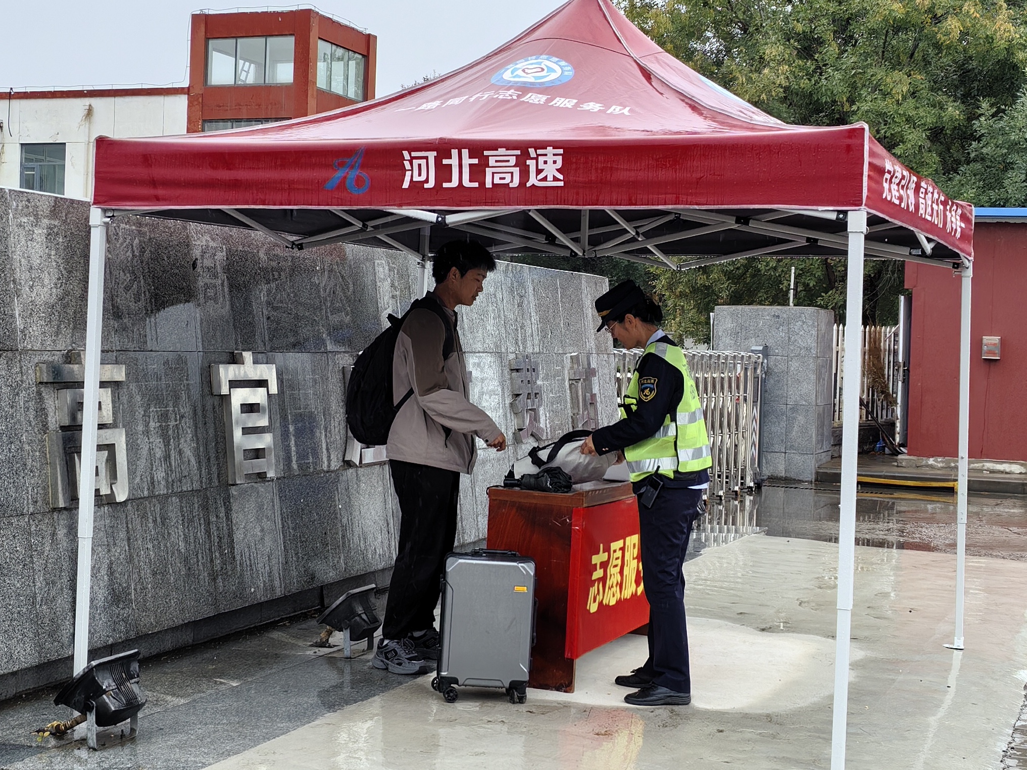 10月8日15时30分,高官庄收费站外广场上,一名大学生一手推行李箱、一手拎包,背着书包,在雨中独自撑伞前行。疏导员发现这一情况后,立即主动上前提供帮助。