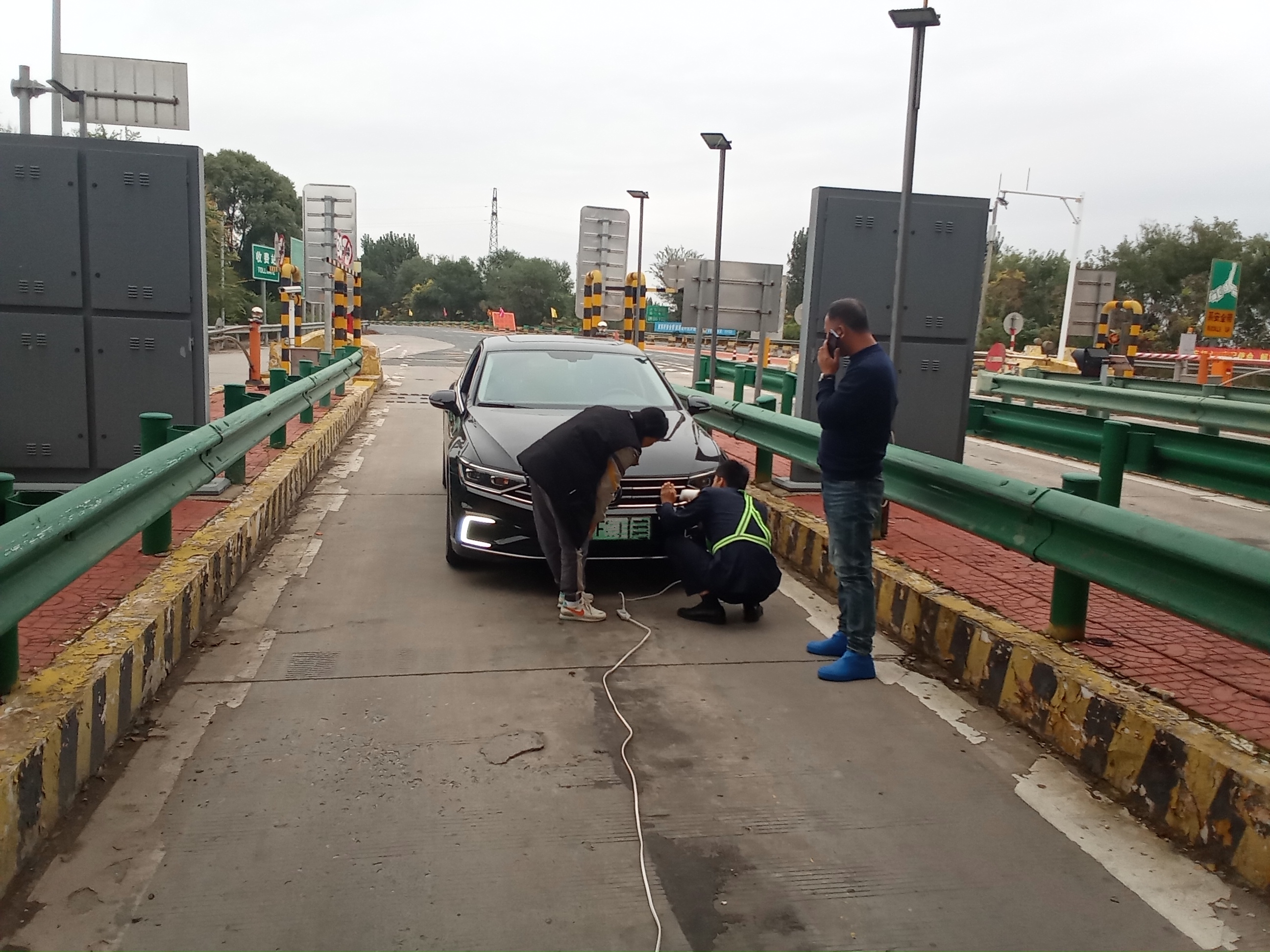 10月17日,在河北高速固安南收费站,电动汽车司机师傅对着收费员连连道谢,困扰他的车辆故障在工作人员的巧手下顺利化解。