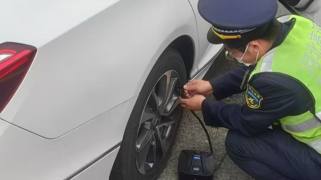 收费员第一时间安抚司机情绪,同时立即用对讲机上报当班班长。接到消息后,班长迅速携带站内常备的便民充气设备赶到现场。他熟练地连接设备、检测胎压、精准补气,整个过程有条不紊。期间,班长还贴心提醒司机,长途行车前务必全面检查轮胎、油液等关键车况,提前排除安全隐患。短短几分钟后,轿车轮胎气压恢复正常。司机反复检查确认无碍后,对收费站工作人员的高效响应和热心帮助连连道谢,随后安心驾车离去。