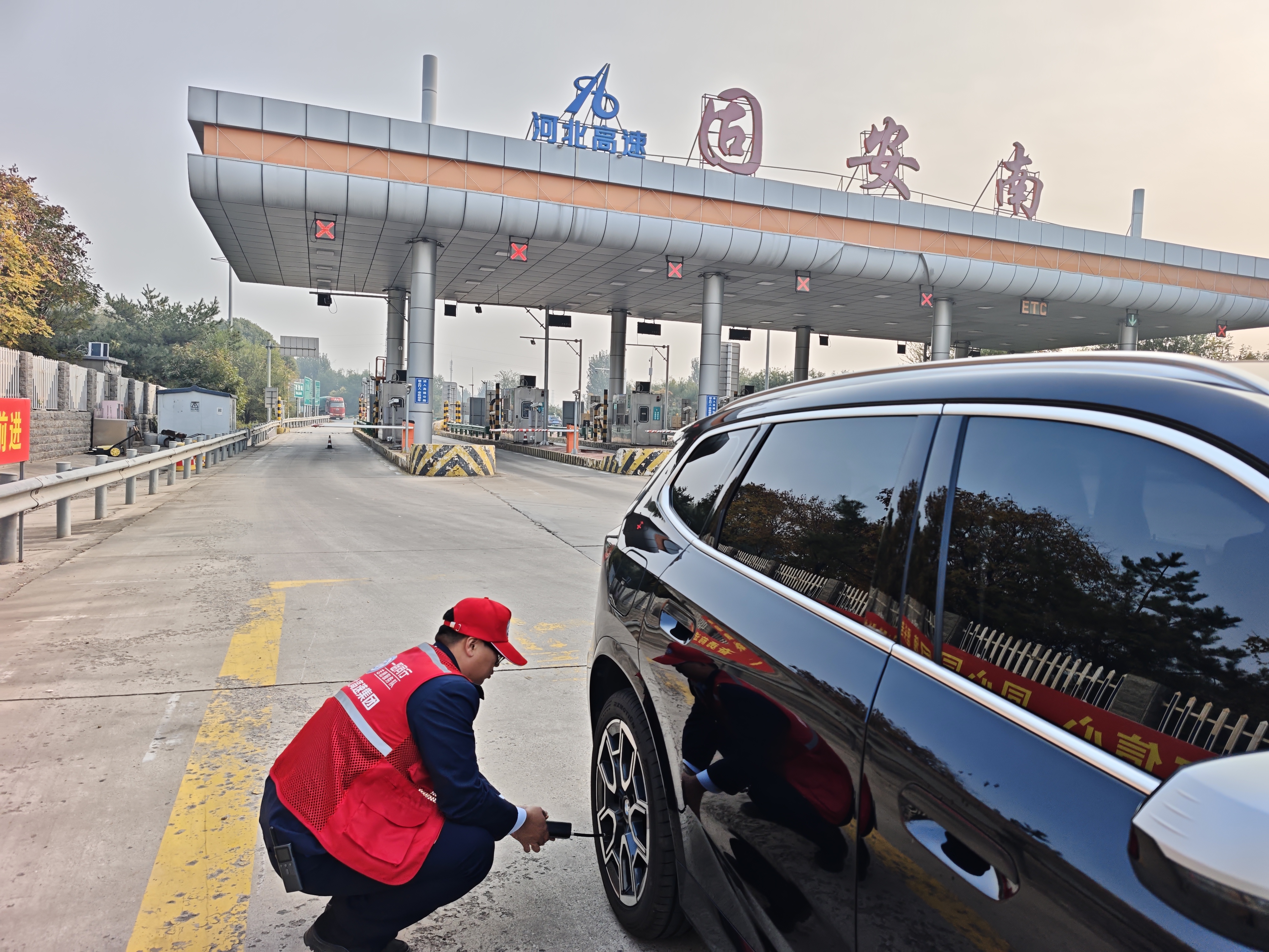 11月5日下午三时,固安南收费站收费班长在车道巡查时,发现一辆黑色宝马车缓缓停靠在收费广场安全区域,女司机下车后神色焦急地查看车辆轮胎。见状,班长立即上前询问情况。经了解,该女子驾车从天津返程,行驶途中突然出现胎压监测报警,车辆右后轮胎胎压不足,因不熟悉周边环境,又担心继续行驶存在安全隐患,只好紧急停靠在此寻求帮助。