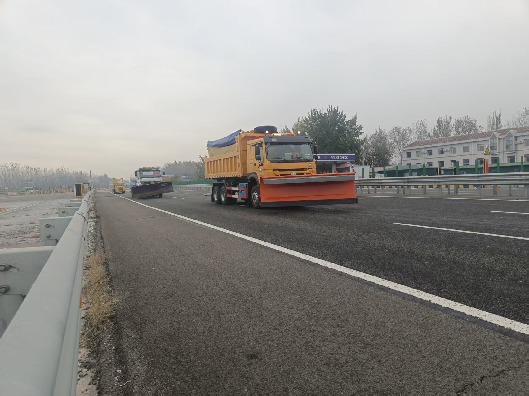 演练前夕,各单位就冬季除雪的各项准备工作进行了充分的协调与沟通。演练过程中,现场模拟了香河辖区突发雪情,除雪保畅领导小组迅速启动应急预案,各单位严格按照职责分工展开除雪保畅作业。第一阶段应对小雪,一台液态撒布车在预警车的引导下有序推进,精准控制融雪剂流量,为路面积雪初步融化奠定基础;随后,固态撒布车跟进巩固,在后方防撞车辆的全程护航下,结合实时路况调整撒布密度,确保融雪剂均匀覆盖。第二阶段应对中到大雪,四台铲雪车以阶梯队形同步推进,前后保持安全车距,雪铲紧密搭接,高效完成积雪清除。整场演练紧张有序,各环节衔接顺畅,迅速实现全路段积雪清零,道路迅速恢复安全通行能力。