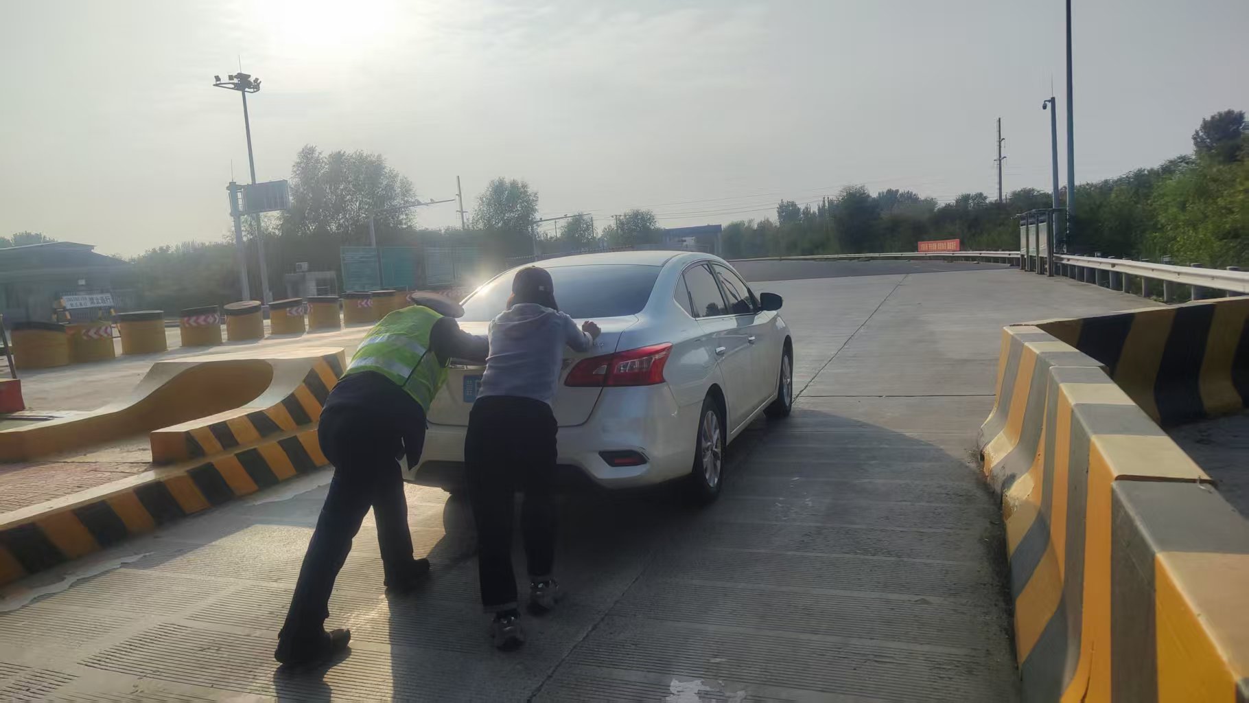 一辆白色轿车在收费窗口前突然熄火,无法启动。司机焦急地向收费员求助。收费员第一时间上报班长,班长迅速赶到现场。考虑到车道车流较大,为避免交通拥堵,他与司机合力将车辆推至收费广场安全区域,并摆放三角锥做好警示。