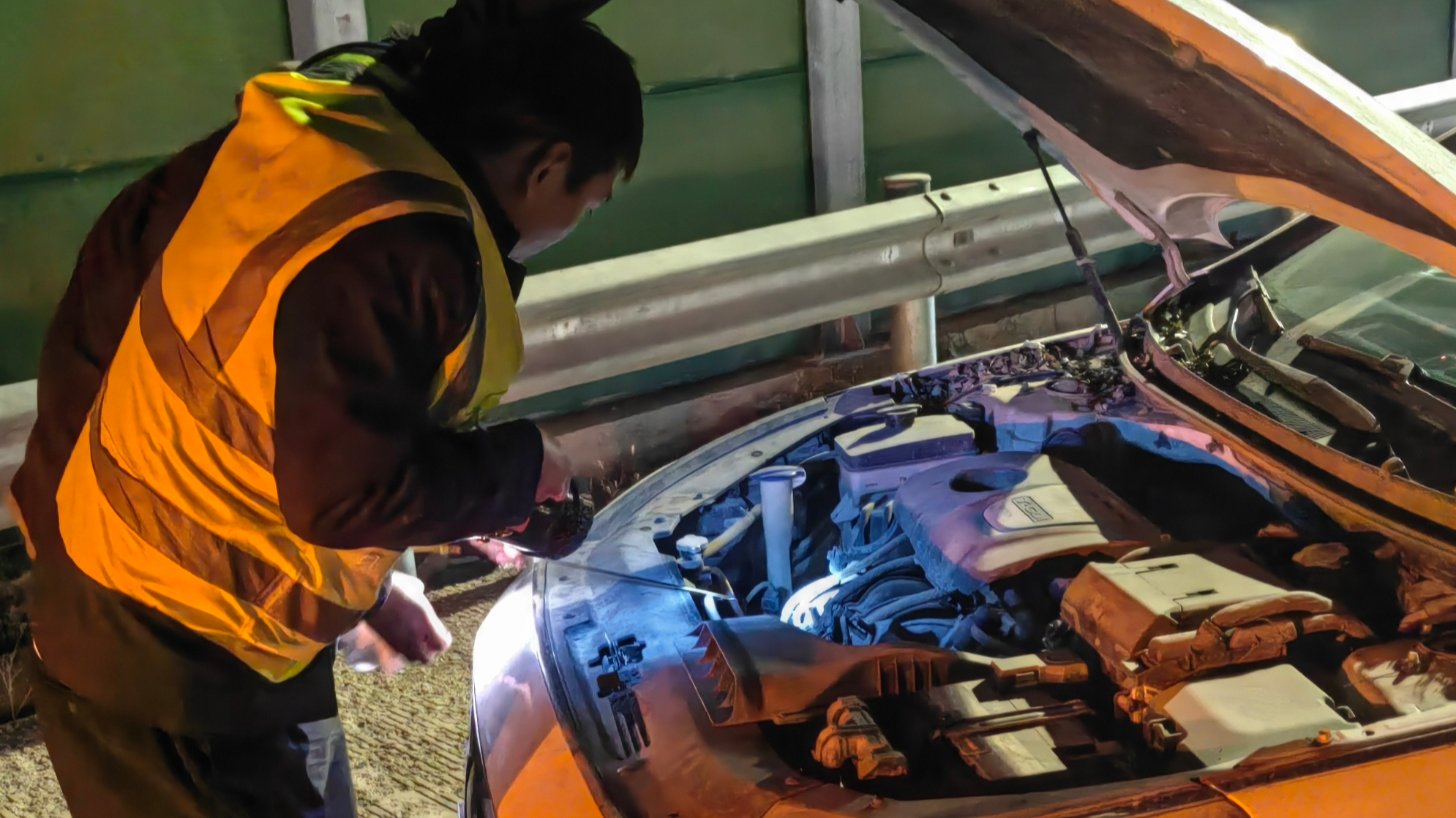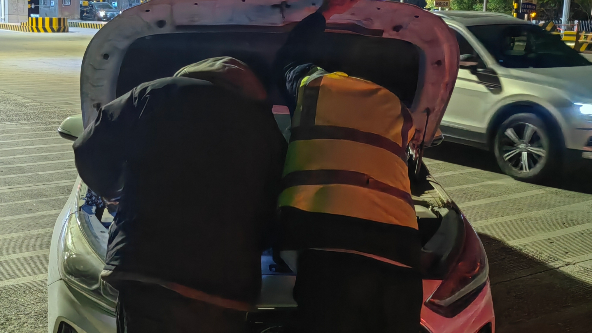 11月25日晚高峰时段,燕郊西收费站内广场不远处,一辆汽车突然开启双闪停在护栏旁,无法继续行驶。见此状况,班长第一时间赶赴现场询问情况,得知车辆因发动机水温过高突发故障,司机焦急万分。面对紧急情况,班长一边耐心安抚司机情绪,告知其无需慌张,一边迅速组织人员开展救援。