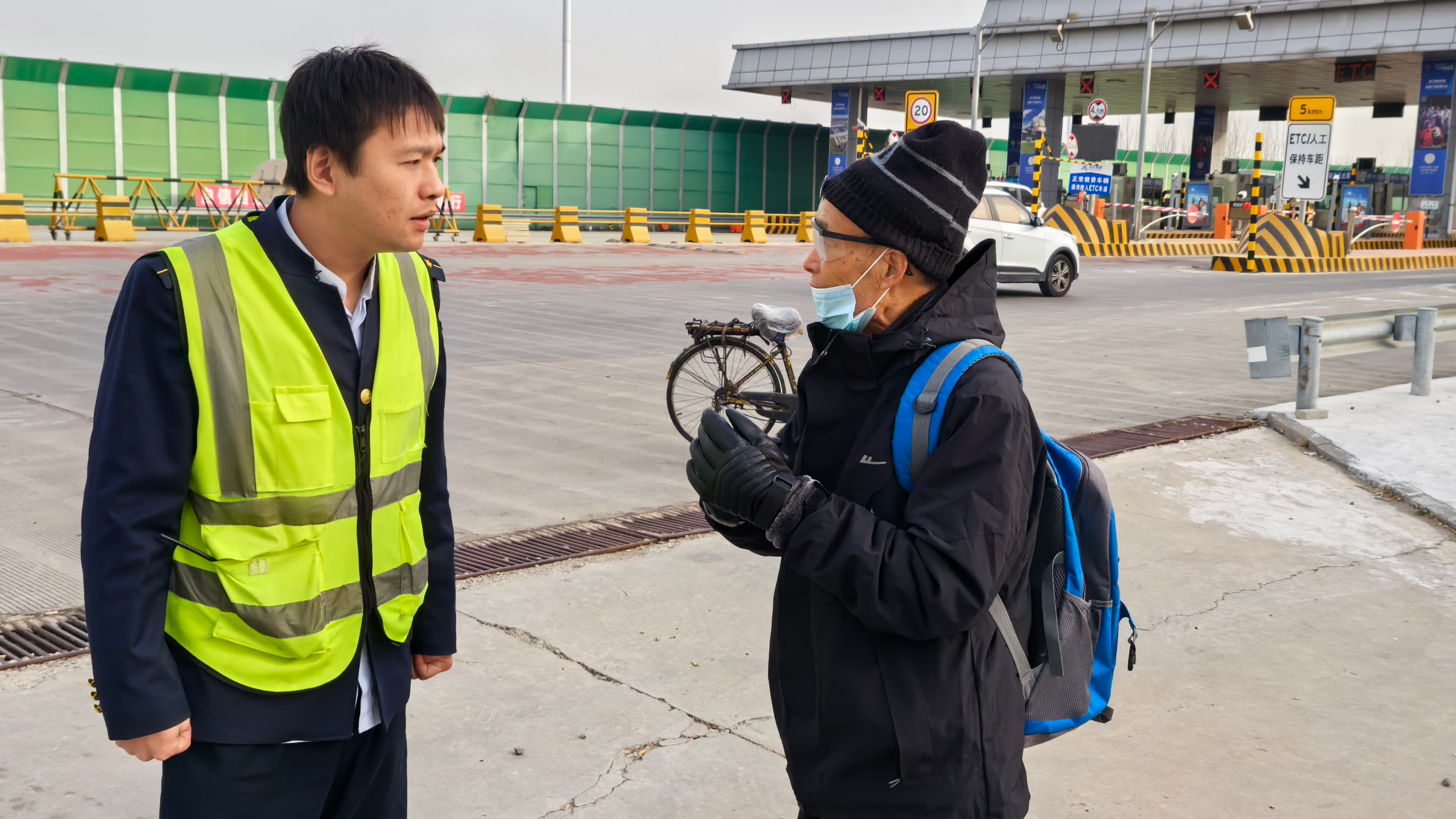 11月26日早上八点左右,正值早高峰时段,廊坊分公司燕郊西收费站一班备岗人员如往常般在岗上巡查,突然发现外广场有一位老人推着自行车向车道方向行进。考虑到该时段车流量大、车辆密集,为避免发生交通事故,备岗人员立即快步上前,将老人安全引导至广场安全地带。