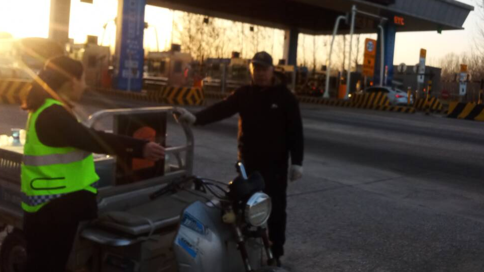 11月30日16时13分,香河西收费站入口处车流不息,一位老人驾驶电动车突然闯入收费车道,骑行速度较快,现场交通安全风险陡增。正在岗亭值守的收费员发现险情后,立即高声示意劝阻,见老人未及时回应,迅速起身冲出岗亭上前拦截,并通过对讲机紧急呼叫正在附近疏导车辆的收费人员。
