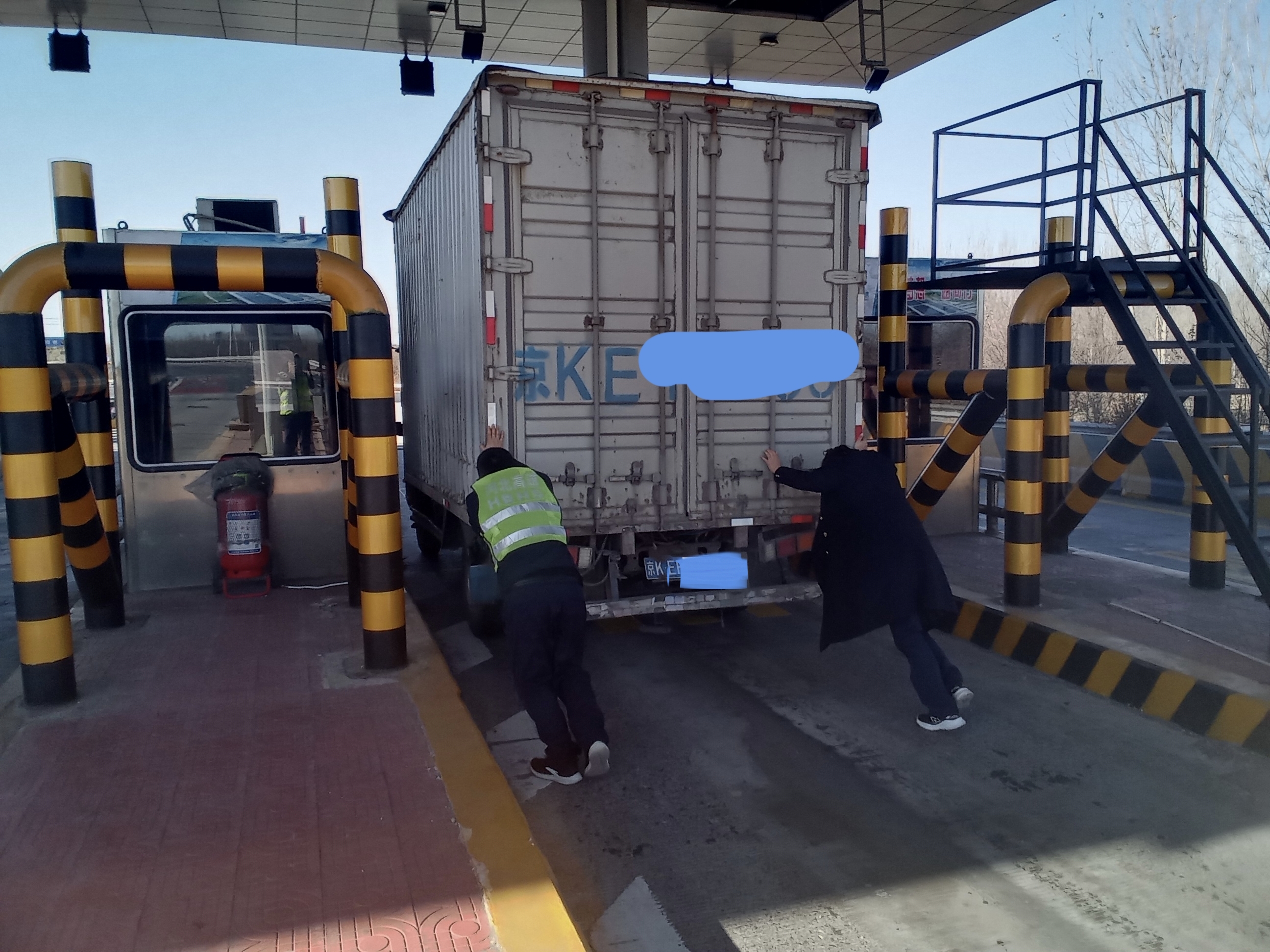 收费员迅速上报,班长即刻带领备岗人员赶赴现场。为保障道路畅通,工作人员齐心协力,将故障车辆推移至收费广场外侧安全区域。时值寒冬,工作人员顶着凛冽寒风高效处置,最大程度降低了对通行的影响。