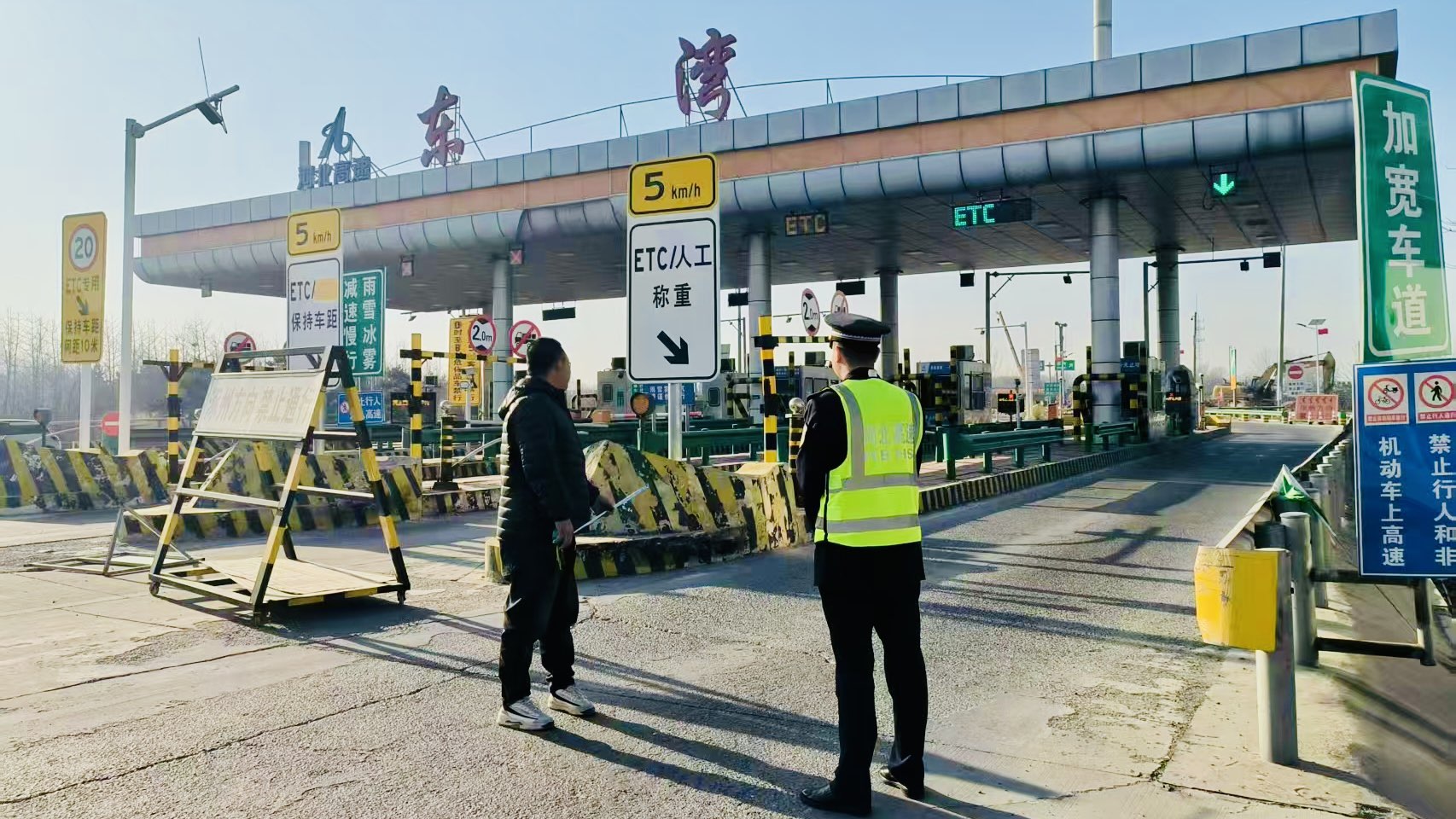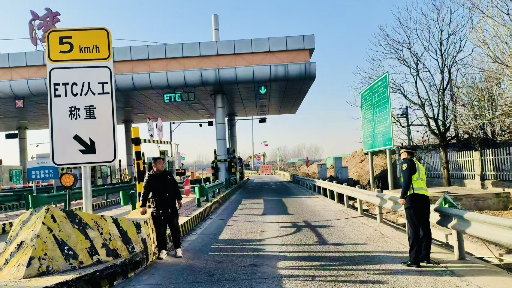 12月10日上午,一辆大件运输车缓缓驶近东湾收费站。司机因担心车辆超宽无法安全通过,向工作人员求助测量车道宽度。