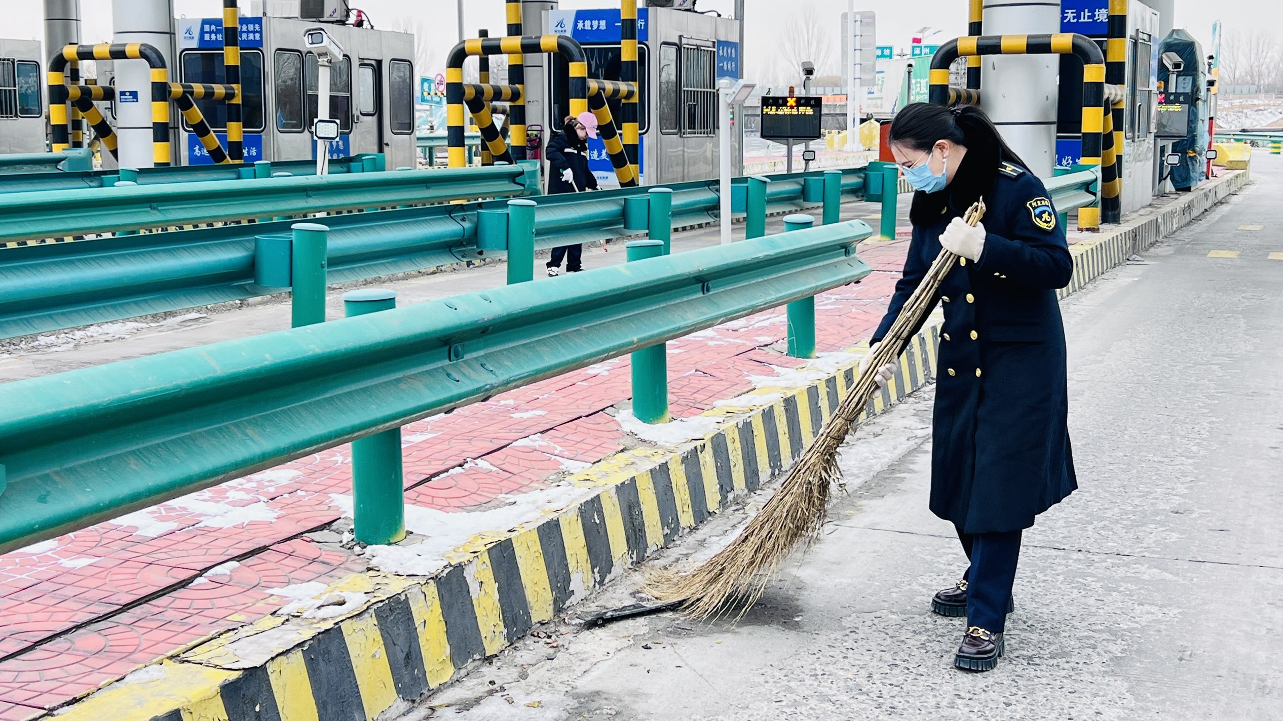 行动中,职工们不畏严寒,分工协作,积极投入到各项清洁工作中:有的手持扫帚清理车道,确保通行无阻;有的用温水仔细擦拭收费岗亭门窗、摄像头及信号灯,保持视野清晰;还有的着重对岛头、防撞柱、标志标牌等部位进行除尘除污,确保各类设施醒目、完好。通过全员努力,收费站环境在严寒中依然保持整洁有序,为往来车辆提供了温暖而畅通的出行体验。