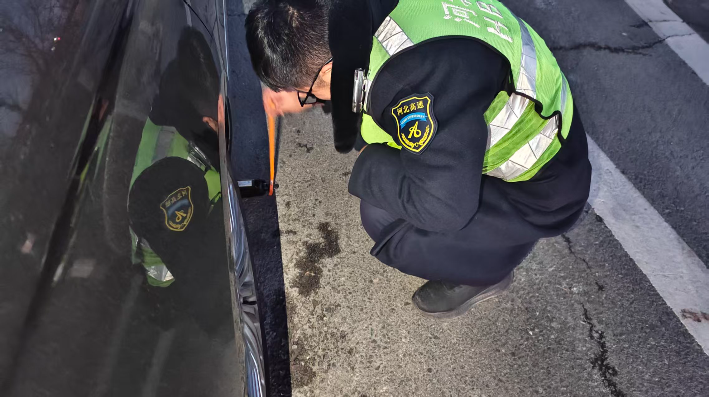 12月28日17时20分,一辆黑色轿车在完成缴费后停靠于廊坊分公司蒋福山收费站收费外广场,车主焦急挥手求助。当班班长发现后迅速上前问询,得知车辆轮胎被钉子扎破,车主因未携带千斤顶无法自行更换备胎,正手足无措。