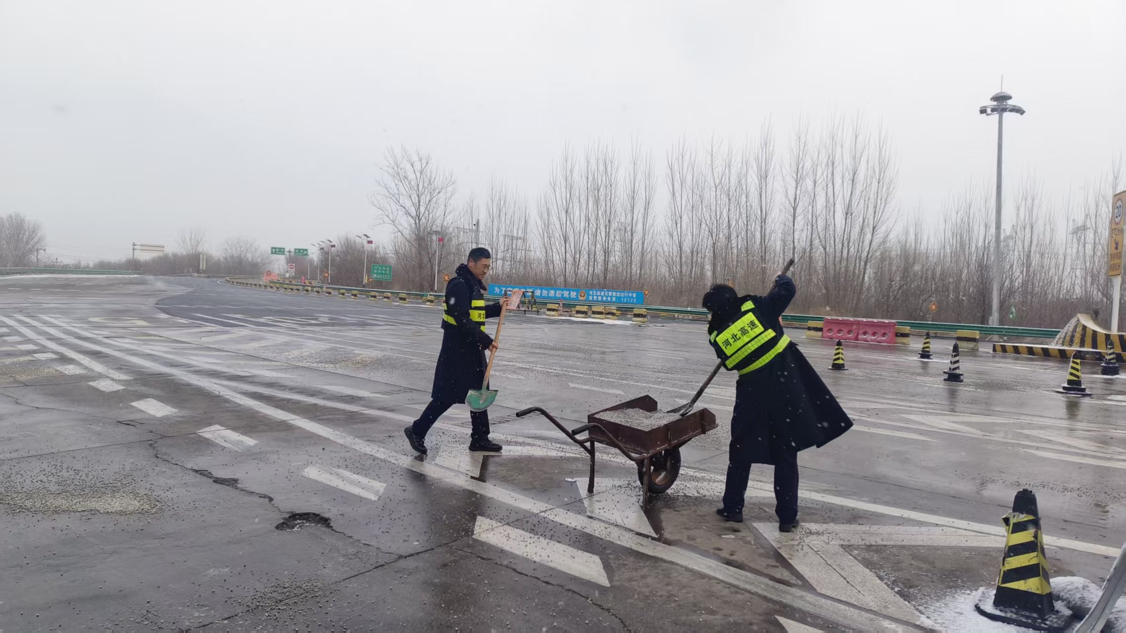 1月17日,寒潮来袭,廊坊地区降雪明显,给高速公路通行带来诸多不便。为保障收费站口及辖区路段安全畅通,固安东收费站迅速启动恶劣天气应急预案,全体职工以雪为令、闻雪而动,全力开展除雪保畅工作。