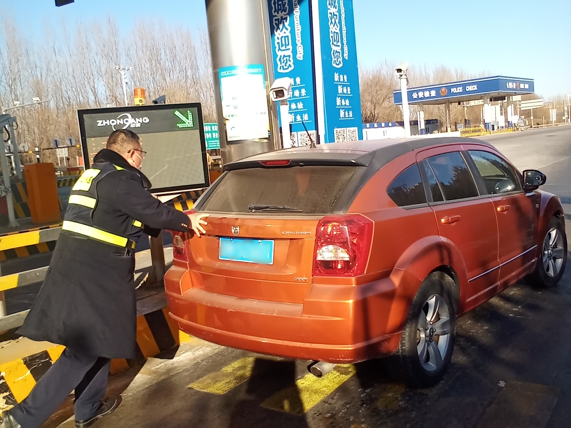 当天上午,寒风凛冽。一辆小型轿车行驶至香河东站出口车道时,突然熄火无法启动,停滞在收费道口,不仅影响了后续车辆通行效率,也让车主焦急万分。正在现场巡岗的收费班长发现情况后,立即上前询问情况。得知车辆因突发故障熄火,车主尝试多次启动均未成功,且车内未携带应急工具时,班长一边安抚车主情绪,一边迅速安排疏导员在车辆后方设置警示标志,引导后续车辆有序分流,避免造成拥堵。