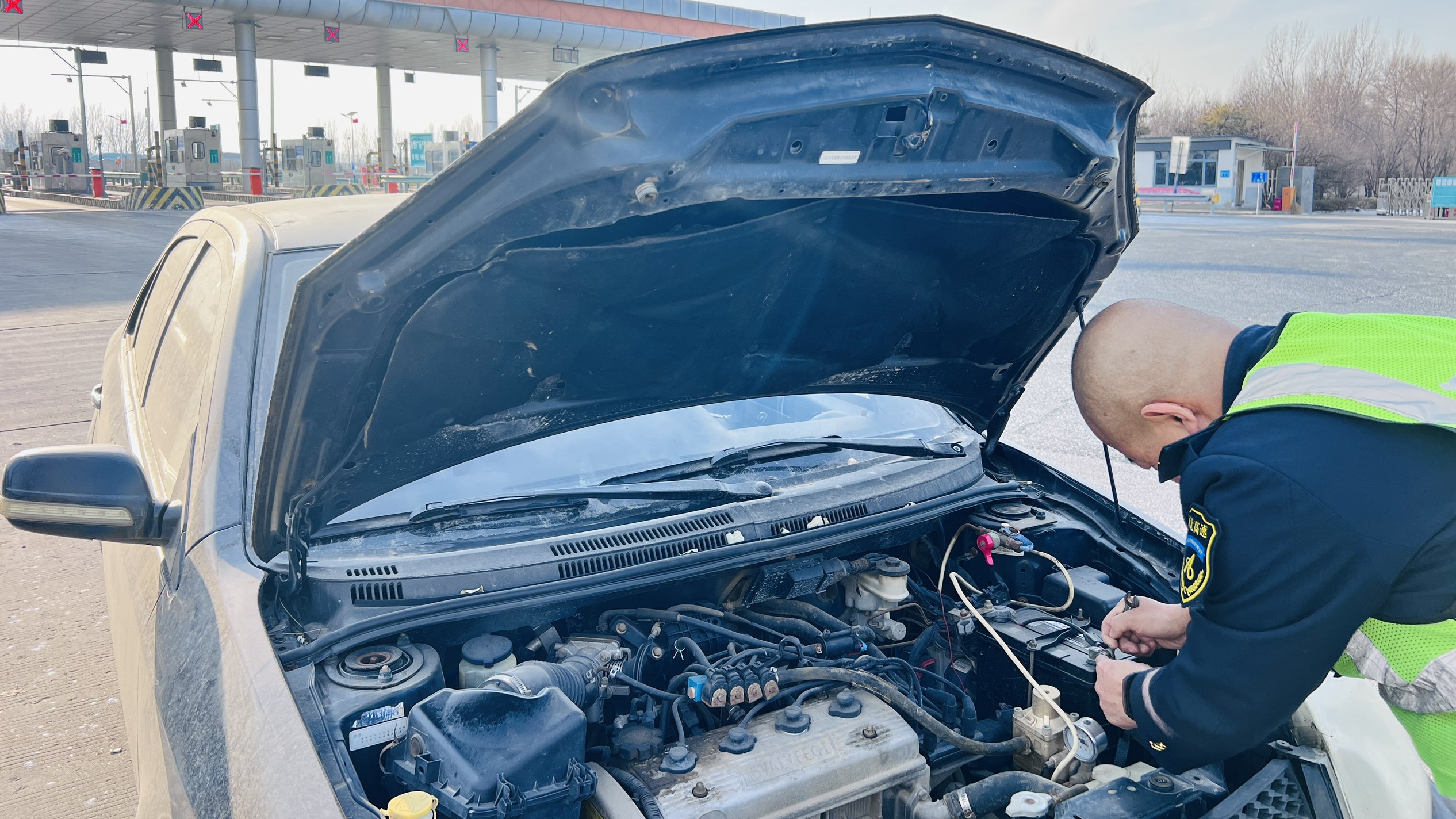 1月27日,一辆私家车在东湾收费站广场突然熄火,无法启动。司机正在焦急时,收费站工作人员已迅速上前查看。
