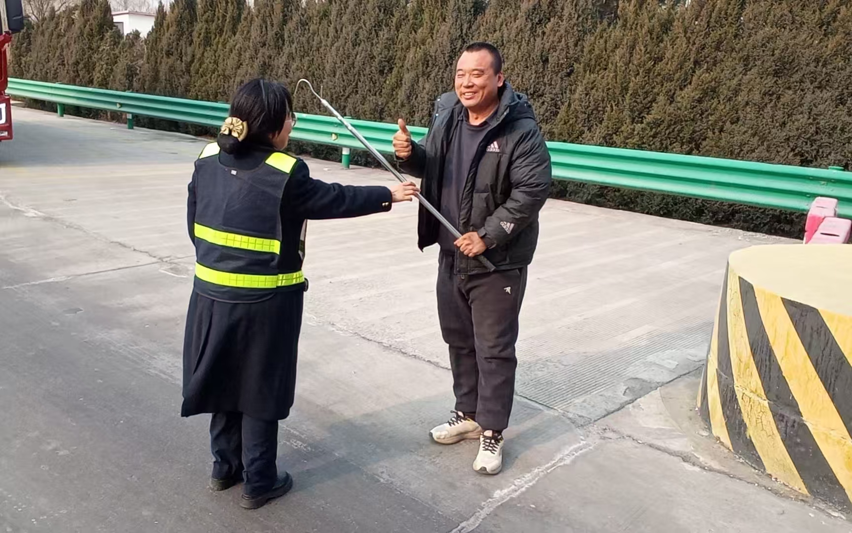 彼时该司机已行驶至高速路段,尚未察觉物品遗失,接到收费站的来电后又惊又喜,对收费员的细心与负责连声致谢。当日下午,司机专程驱车返回固安东收费站取回篷布撑杆,现场对收费员的暖心服务竖起大拇指,再次表达感谢。