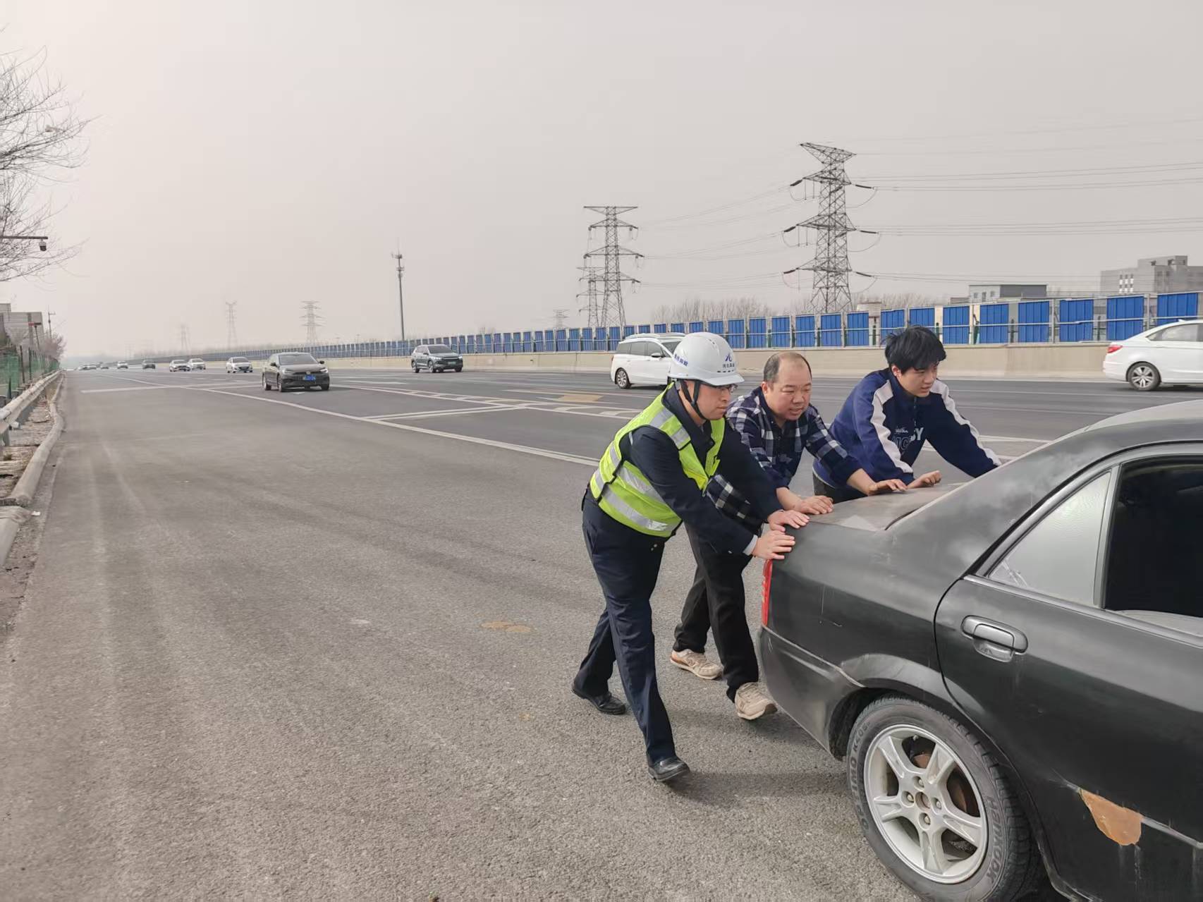 2月21日,正值春运返程高峰,首都环线高速车流量持续高位运行。为保障道路安全畅通,广阳保通保畅应急大队全面加强值班值守与路面巡逻力度。14时40分许,大队值班领导通过视频巡查系统进行实时路况监测时,发现车流中有一辆小汽车突发故障,停滞在应急车道上,司机正艰难地试图推车前行,情况十分危险。值班领导立即通知正在附近路段执行巡逻预警任务的保畅队员。