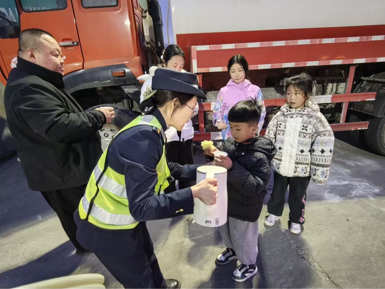 见司乘人员面露焦急、手足无措,当班班长第一时间上前安抚,详细了解事故情况,在确认车上人员均无受伤后,迅速引导车辆停靠至收费广场安全区域,避免在车道内逗留引发安全隐患。随后,班长为一家人送上饮用水,主动邀请他们到便民服务亭取暖休息,并耐心陪伴等候救援车辆,全程贴心细致、服务周到,用暖心举措缓解了司乘人员的紧张情绪,用心守护春运归途。