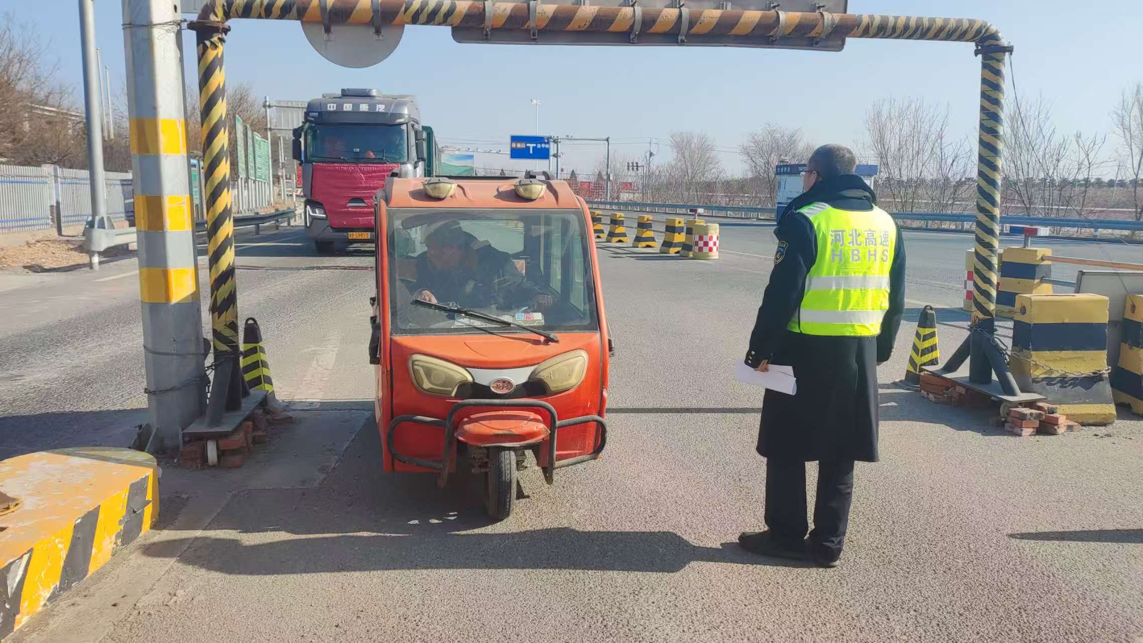 2月27日,在廊坊分公司蒋福山收费站入口广场,一场关于生命安全的“温情劝阻”正在上演。当班收费班长在巡查中发现,一辆非机动车正试图驶入高速公路,情况危急。班长立即上前进行礼貌拦截,并迅速将车辆引导至安全区域。