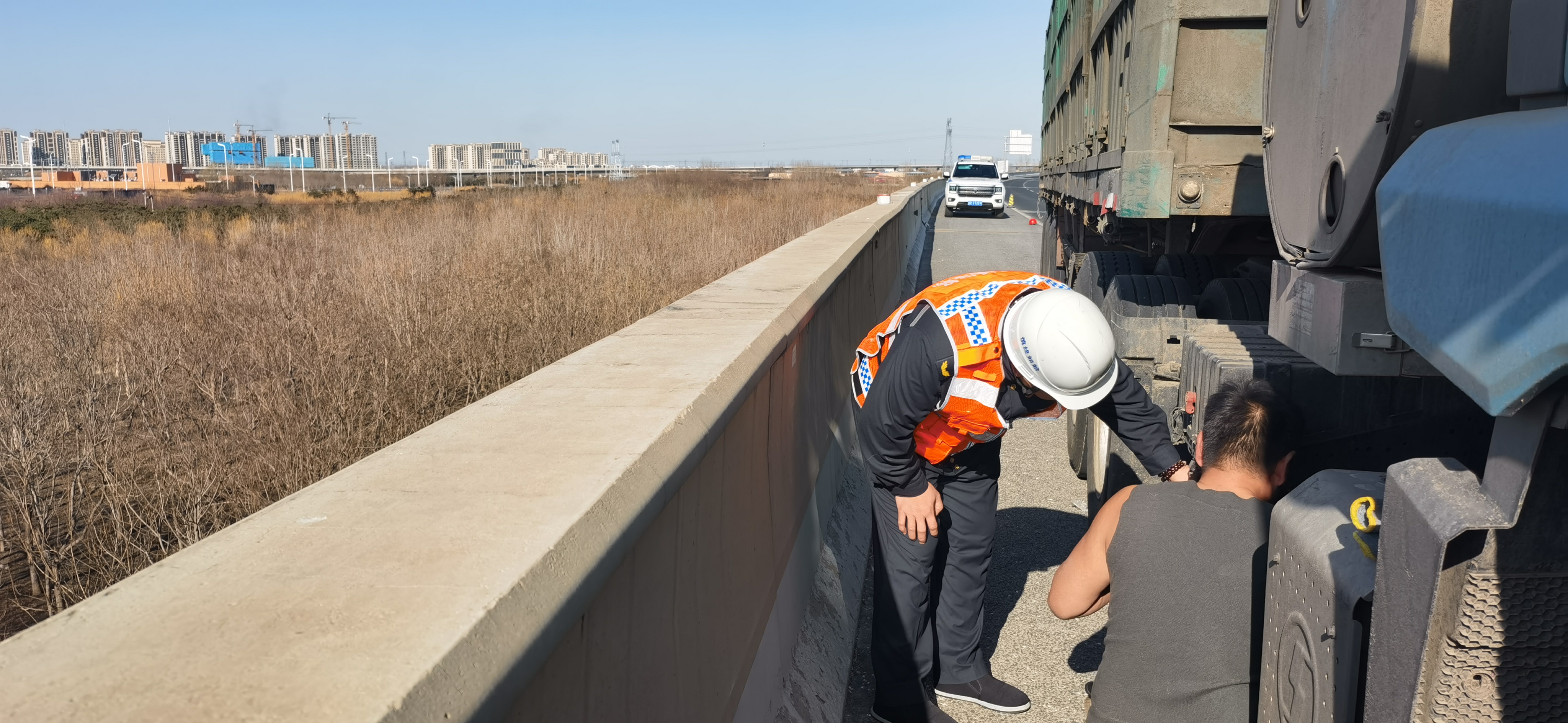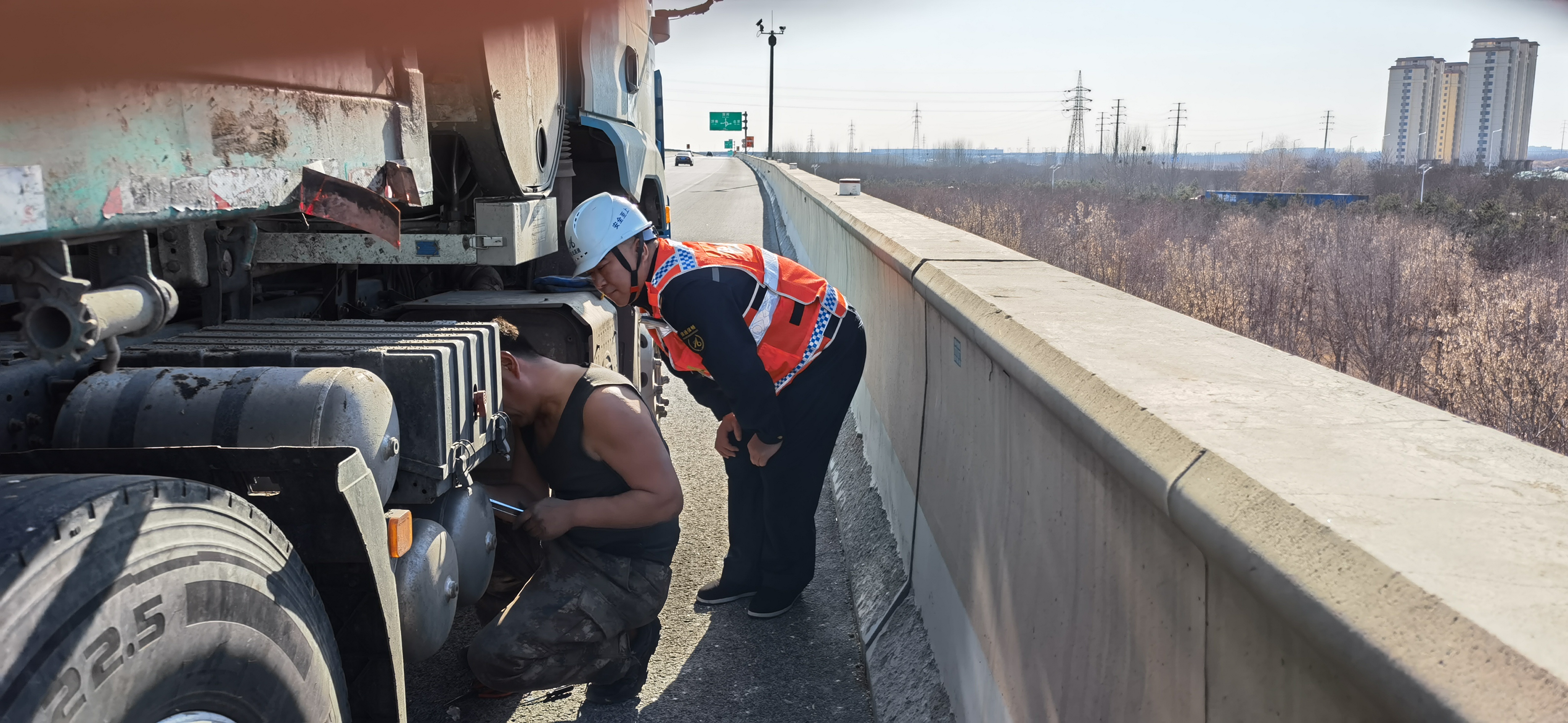 随后,他们迅速下车,快速且规范地摆好防护锥桶,同时协助司机排查故障并进行抢修。他们密切关注过往车辆的行驶动态,在现场进行预警指挥,全力保障故障货车抢修现场的安全。在刘伟科和吕清海的协助下,司机很快完成了抢修工作,货车驶离现场,道路恢复了畅通。