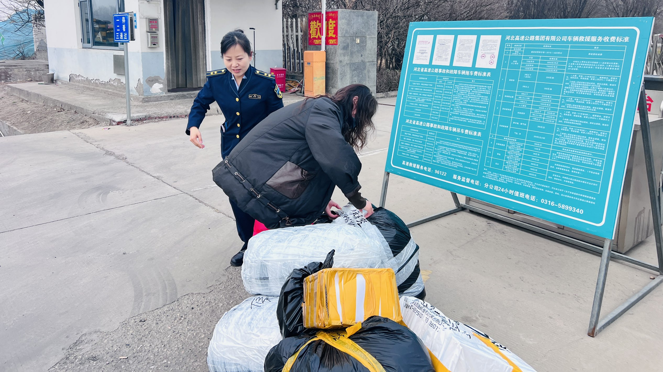 当班收费员发现后上前询问,得知女士的困境,当即与同事一起将货物逐一搬运至站内便民服务亭存放,帮她解决了货物看管的难题。