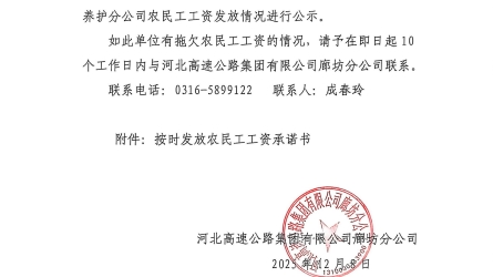 河北高速公路集团有限公司廊坊分公司关于河北冀翔通电子科技有限公司2024年机电设施改造工程农民工工资发放情况的公示[详细]
